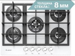 Газовая варочная панель, белого цвета поверхность - стеклянная, с толщиной в 8 мм. Пять конфорок размещены на рабочем столе шириной 70 см, монтажный проем позволяет встраивание в мебельный корпус шириной 60 см. Газовые горелки расположены на широком защитном основании, сверху накрываются чугунными решетками (составные, 3 панели). Все конфорки - различного диаметра и мощности, оснащены газ-контролем (перекрывает подачу газа к горелке при угасании пламени). Электроподжиг встроен в поворотные ручки, мощность пламени регулируется поворотом переключателя, есть фиксированное положение "малое пламя" - минимально возможное горение. Для быстрой обжарки продуктов на тонкостенной посуде и нагрева большой кастрюли с водой - предусмотрена двухзонная конфорка, с двумя рядами пламени.
