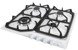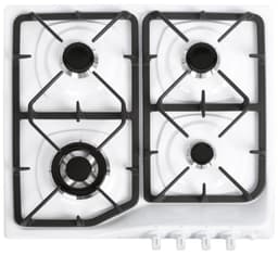 Белая эмалированная варочная панель шириной 59 см. Газовые конфорки: 2 стандартные, экономичная и большого диаметра, с быстрым нагревом. Мощность пламени регулируется поворотными ручками, нижнее положение переключателя - экономичное горение (малое пламя). Электроподжиг осуществляется нажатием кнопки на наклонной панели управления, сами конфорки дополнены фигурными и составными чугунными решетками.