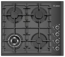 Газовая варочная панель шириной 60 см, стеклянная рабочая поверхность - черного цвета. Управление газовыми горелками осуществляется поворотными переключателями, вынесенными на край панели. Мощность горения определяется пользователем прибора самостоятельно, для экономного горения предусмотрено фиксированное положение - малое пламя. Четыре конфорки (две стандартные, конфорка с двумя контурами пламени и малая) оснащены автоматическим электроподжигом, встроенным в ручки управления и газ-контролем. Фигурные чугунные решетки надежно защищают горелки и выдерживают вес тяжелой металлической посуды.