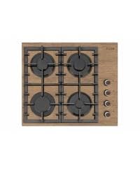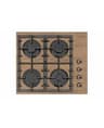 Газовая варочная панель шириной 60 см, стеклянная рабочая поверхность - коричневого цвета. Декорированные ручки, на стекло нанесен рисунок текстуры дерева. Управление газовыми горелками осуществляется поворотными переключателями, вынесенными на край панели. Мощность горения определяется пользователем прибора самостоятельно, для экономного горения предусмотрено фиксированное положение - малое пламя. Четыре конфорки (две стандартные, большая и малая) оснащены автоматическим электроподжигом, встроенным в ручки управления и газ-контролем. Фигурные чугунные решетки надежно защищают горелки и выдерживают вес тяжелой металлической посуды.