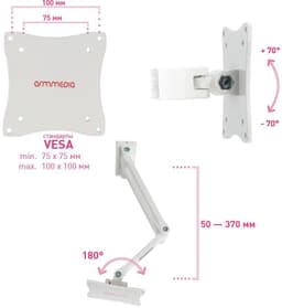 ARM MEDIA LCD-7101 надёжно удержит экран размером 10"-26" дюйма и весом 15 кг. Простая конструкция ARM MEDIA LCD-7101 идеально подойдет для самостоятельного монтажа. Наклонно-поворотная регулировка позволит наклонять вверх и вниз на ±70°, поворачивать влево и вправо на 180°, и выдвигать на 50-370 мм.