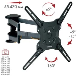 KROMAX OPTIMA-407 GREY TITAN надёжно удержит экран размером 22"-65" дюйма и весом 45 кг. Простая конструкция KROMAX OPTIMA-407 GREY TITAN идеально подойдет для самостоятельного монтажа. Наклонно-поворотная регулировка позволит наклонять вверх и вниз на +5 -15°, поворачивать влево и вправо на 160°, и выдвигать на 55-470 мм.