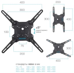 Кронштейн подходит для большинства телевизоров популярных брендов, таких как Samsung, LG, Sony, Panasonic, Sharp, Toshiba, KIVI, Xiaomi Mi, SUPRA, Hyundai, Erisson, Horizont, JVC, Thomson, HAIER, BBK, Витязь, Веко, BQ, OZON, SkyLine, Pioneer, Philips, Rolsen, Harper, Hisense, Hitachi, Polarline, Prestigio и других.