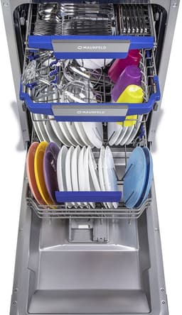 корзина для столовых приборов, освещение, полки для кружек, разбрызгиватель над верхней корзиной, складные держатели тарелок