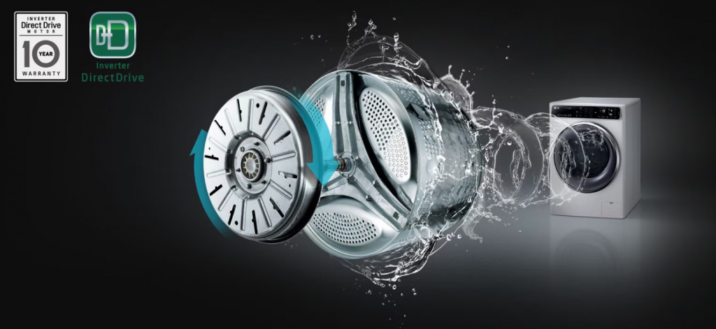 Система прямого привода не имеет в своей конструкции щеток и ремня, поэтому в процессе работы создает гораздо меньше шума. Поскольку ось вращения двигателя и барабана совпадает, уровень вибрации снижается до минимума.