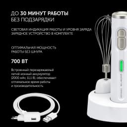 До 30 минут автономной работы. Время зарядки аккумулятора 5 часов. Чаща для измельчения 0,5 литра. Мерный стакан с крышкой объемом 0,7 литра. Аккумулятор: Li-ion 2000 мАч, 11,1 В.
