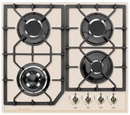 Газовая варочная панель кремового цвета на стеклянном основании, ширина 60 см. Четыре конфорки установлены на широком основании, мощность и диаметр горелок - от маленькой и экономичной до мощной, с двумя рядами пламени. Все горелки с газ-контролем, мощность пламени регулируется поворотными переключателями, есть режим минимального горения без затухания - "малое пламя". Электроподжиг встроен в ручки управления. Составные чугунные решетки - легко чистятся, не боятся тяжелой посуды и надежно защищают конфорки от повреждения.