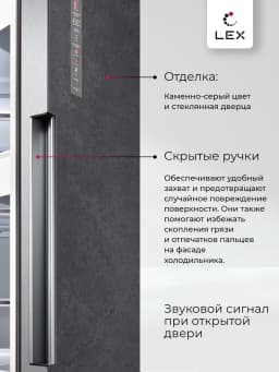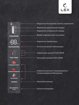 визуальная индикация отключения электропитания, звуковой сигнал незакрытой двери, температуры