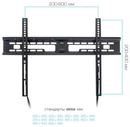 Простая установка при помощи встроенного водяного уровня. Надежная стальная конструкция максимальная нагрузка до 65 кг. Крепление направляющей с «двойным крючком». Универсальная система крепления для любого телевизора с посадочными отверстиями от 32 до 600 мм по горизонтали и от 50 мм до 400 мм по вертикали. Минимальное расстояние до стены 28 мм. Система крепления TechLock обеспечивает легкий монтаж/демонтаж ТВ и его надежную фиксацию.