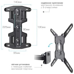 KROMAX OPTIMA-407 GREY TITAN надёжно удержит экран размером 22"-65" дюйма и весом 45 кг. Простая конструкция KROMAX OPTIMA-407 GREY TITAN идеально подойдет для самостоятельного монтажа. Наклонно-поворотная регулировка позволит наклонять вверх и вниз на +5 -15°, поворачивать влево и вправо на 160°, и выдвигать на 55-470 мм.