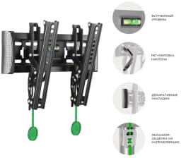 Он отлично подходит для современных ТВ с небольшой диагональю и маленьким весом. Кронштейн выдерживает до 36,4 кг. Крепление универсально за счет множества предусмотренных производителем размеров VESA – 75x75, 100x100, 100x200, 200x100, 200x200 мм. Широкий выбор вариантов монтажных отверстий для установки на стену позволяет надежно зафиксировать кронштейн даже при креплении к не самым прочным поверхностям.