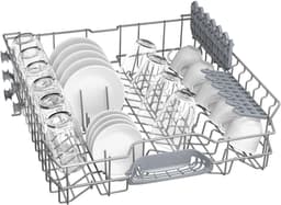 Машина оснащена двумя корзинами, в которые удобно размещать посуду разного размера. В верхней корзине предусмотрены две полочки для чашек, а в нижней – корзина для столовых приборов. Направляющие для тарелок можно складывать, что позволяет оптимизировать пространство внутри машины.