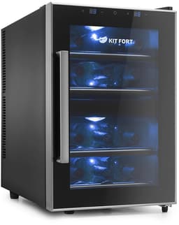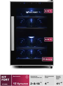 Вместимость 12 бутылок, 2 климатические зоны и индивидуальное освещение, сенсорная панель управления, максимальная разница температур 18 градусов, мощность 140 Вт.