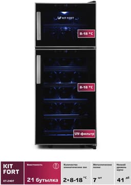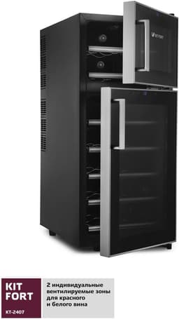 Вместимость: 21 бутылка, 2 индивидуальные вентилируемые зоны для красного и белого вина, индивидуальное управление и освещение, максимальная разница температур 18 градусов, мощность 140 Вт.